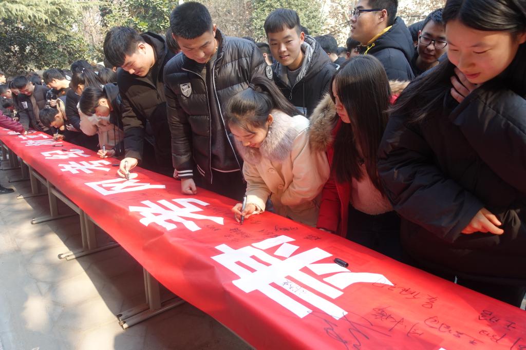 最后,同学们宣誓并在条幅上签字,承诺诚信考试,诚实做人,严肃考纪,杜绝作弊,争做文明大学生!