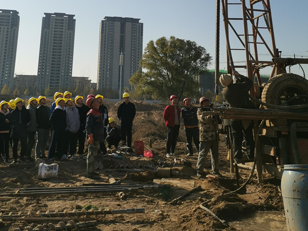 岩土工程勘察地点为郑州近郊某小区的勘察工地,在企业外聘兼职教师的带领下,同学们依次参观静力触探、钻探、钻孔取样、标贯试验等现场勘察方法,学习了不同场地钻孔的布置原则。