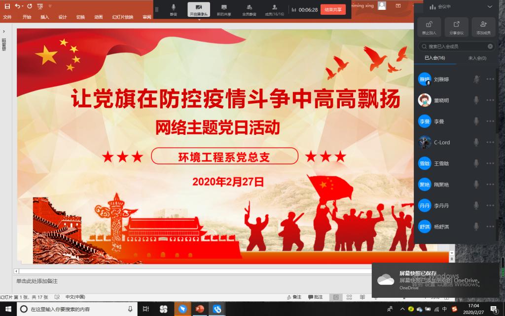 为充分发挥党员先锋模范作用,确保学院疫情防控工作有序开展,环境工程系党总支所属支部于2月27日下午通过钉钉直播平台,开展“让党旗在防控疫情斗争中高高飘扬”网络主题党日活动。