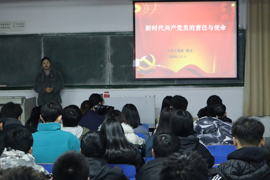 12月3日晚,土木工程系在北教309教室开展“新时代共产党员的责任与使命”主题党课。2019级入党积极分子和有入党意愿的同学参加本次培训,培训由学管老师范玉主讲。