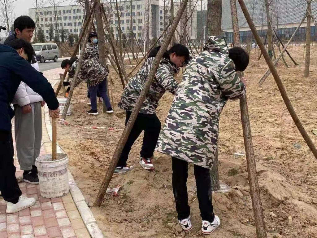 劳动课上,学生们在辅导员的带领下,不畏严寒,不怕脏累,团结合作,为主干道和银杏林的几百棵树木穿上了“防虫防冻”的外衣。冬养一片林,春享一片绿。此次活动不仅使学生参与了劳动锻炼,增强了合作意识,也绿化了校园环境。