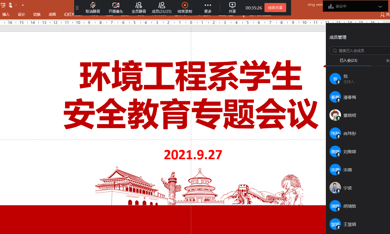 9月27日,环境工程系通过钉钉平台召开学生安全教育专题会议。会议由系党总支书记郭海山主持,系全体学管教师及辅导员参加。