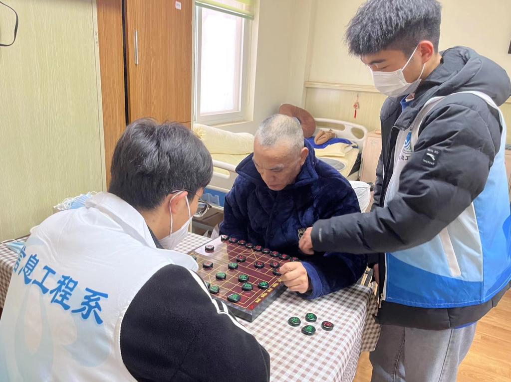 在北林路街道养老服务中心,志愿者们帮助老人们打扫卫生,陪他们聊天、下棋,并表演了文艺节目。