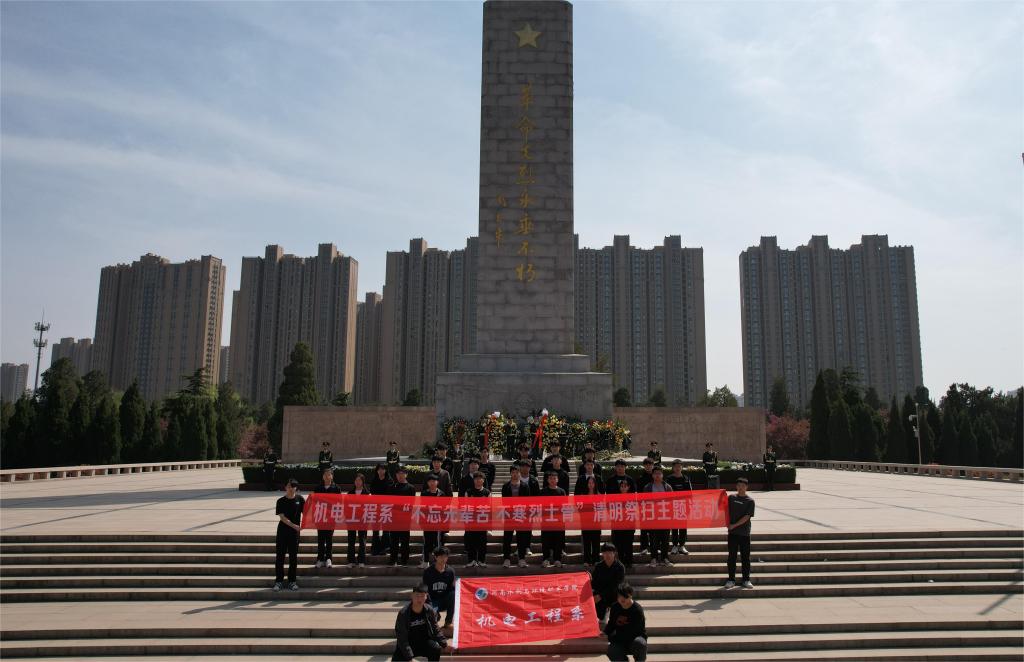 在郑州烈士陵园烈士纪念碑前,国旗班成员向先烈敬献花篮,师生肃立、鞠躬,集体默哀,悼念英魂。系党总支书记王建军在讲话中激励师生要继承先烈遗志,发扬革命精神,珍惜今天来之不易的幸福生活,为强国建设贡献青春力量。