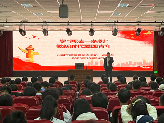 10月24日,水利工程系党总支举办主题为“学‘两法一条例’,做新时代爱国青年”专题党课活动,组织22级入党积极分子和23级递交入党申请书学生认真学习《中华人民共和国国旗法》《中华人民共和国国徽法》和《中国共产党党徽党旗条例》,党课由系党总支书记卢德友主讲。