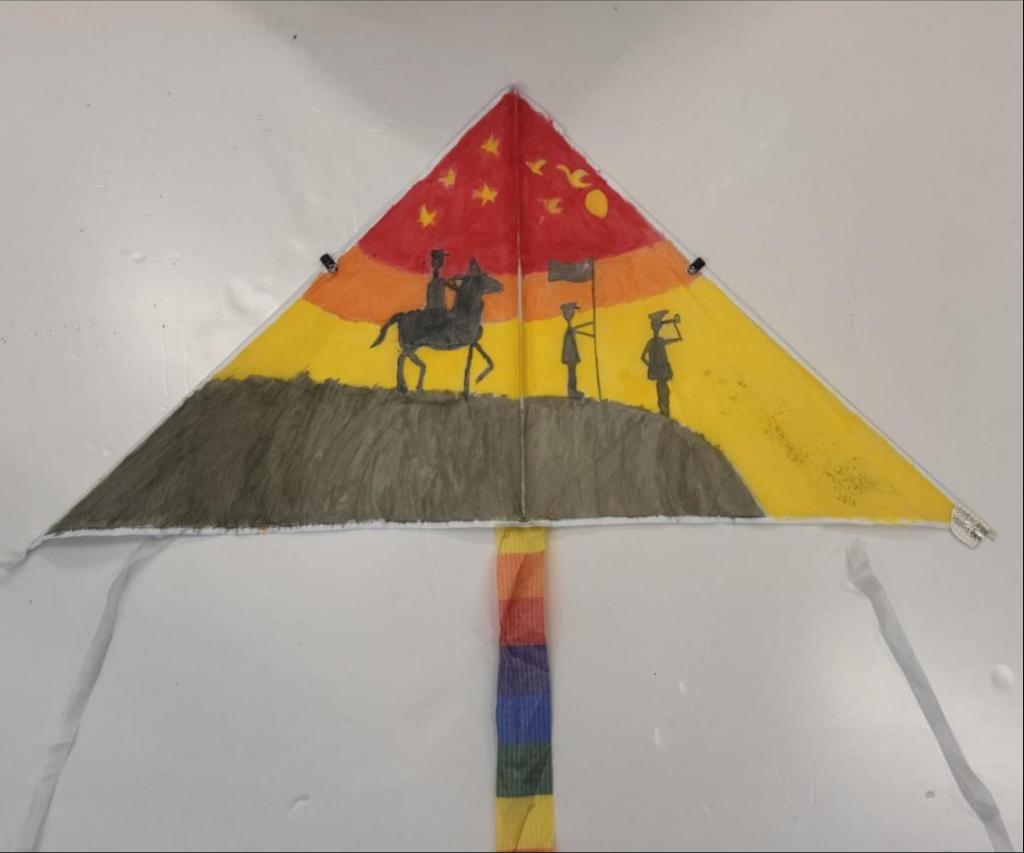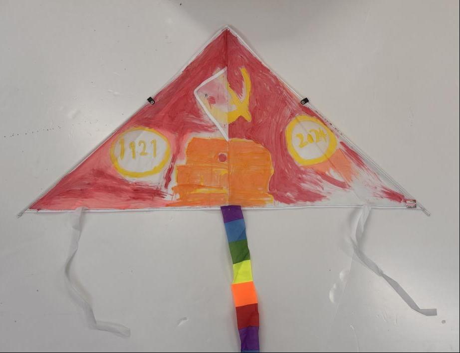 另一幅以爱国为主题的风筝也备受瞩目,它以红色和黄色为主色调,以一面鲜艳的五星红旗为背景,绘制了革命先辈们驰骋战场的场景,表达了对红色基因的传承和对祖国的热爱。