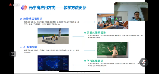 上海三兴教育科技有限公司华中区负责人唐志鹏主讲“元宇宙”讲座,以“职业教育的新机遇”为主题,详细阐述了元宇宙的概念、特性,以及如何为职业教育提供全新的教学方式和学习体验。河南区销售经理李雪在协助演示中展示了元宇宙教育平台的操作界面和功能,特别展示了其在建筑设计与施工模拟方面的虚拟技术教学效果。