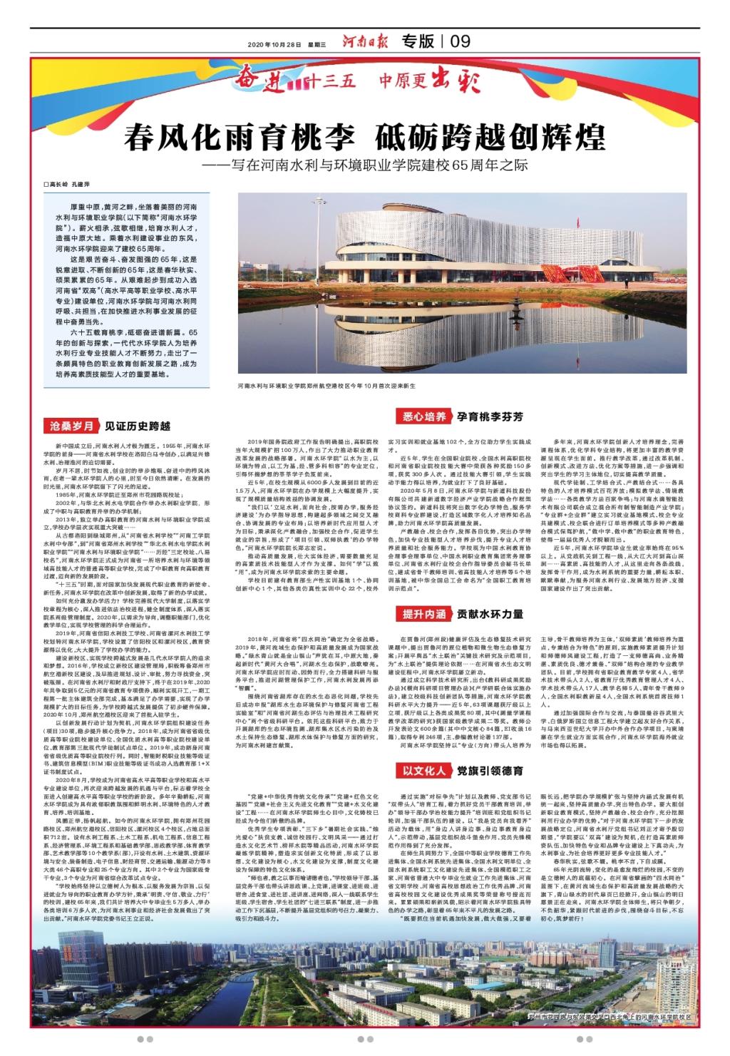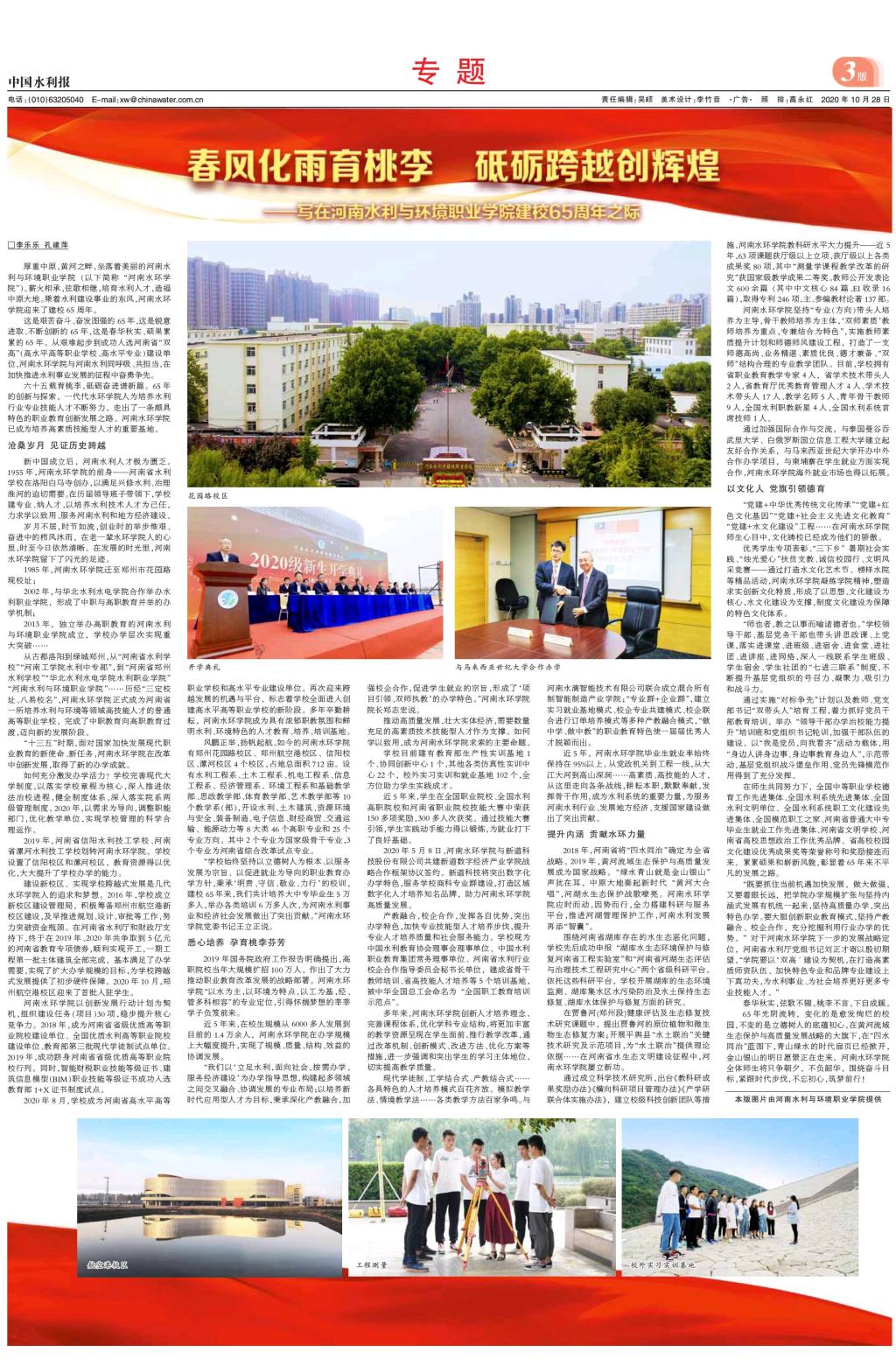 10月28日,《中国水利报》《河南日报》专版刊登文章《春风化雨育桃李 砥砺跨越创辉煌——写在taptap点点体育官方网站建校65周年之际》,从“沧桑岁月 见证历史跨越”、“悉心培养 孕育桃李芬芳”、“提升内涵 贡献水环力量”、“以文化人 党旗引领德育”等四个方面,对taptap点点建校65年来所取得的成就进行了深度报道。