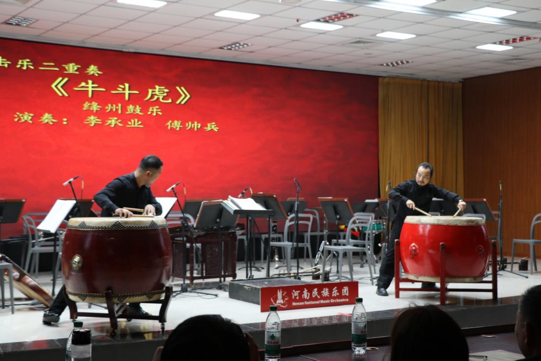 打击乐二重奏《牛斗虎》用两面大鼓象征牛、虎二兽,乐曲通过相遇、相戏、相斗三个乐段为观众展示出牛之倔强凶悍,虎之威武凶猛,引得台下阵阵掌声,将演出氛围推向高潮。
