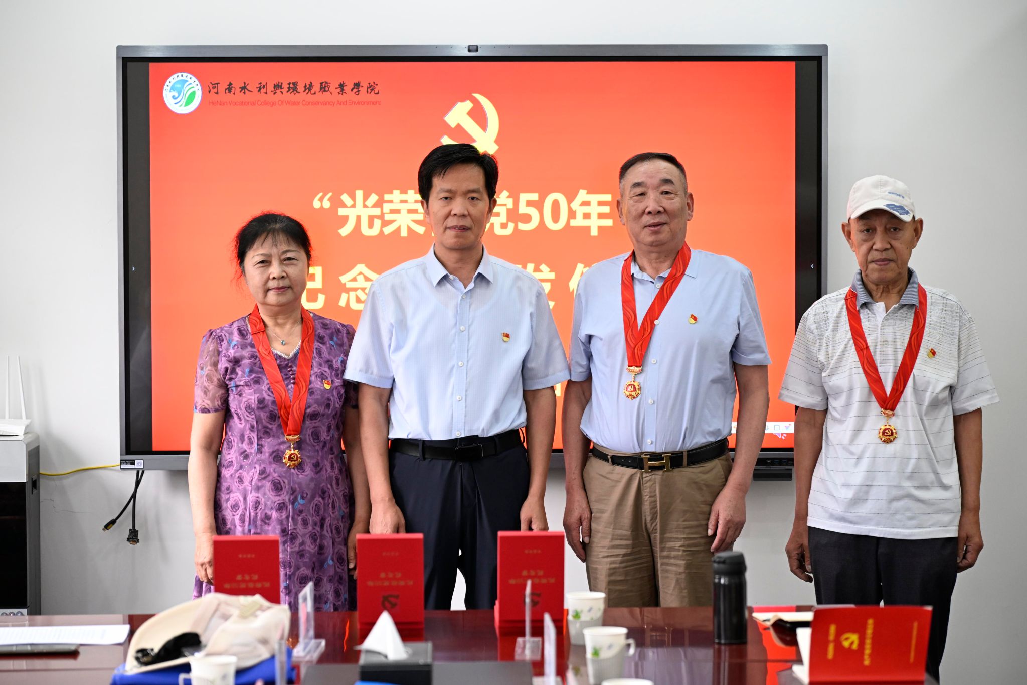 仪式现场,李广慧为3名“光荣在党50 年” 老党员颁发了纪念章,致敬老党员们的坚守与奉献。