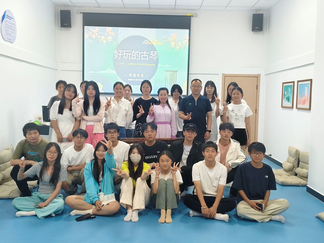 活动伊始,古琴指导教师张欢欢以《好玩的古琴》为题展开分享。他从《沧海一声笑》等经典曲目的意境切入,阐释古琴“清微淡远”的审美如何与心理学中的正念、情绪调节技术相通:“琴音能引导听者回归当下,疏解焦虑,这正是中国传统‘乐教’的现代心理价值。”在实践环节,张欢欢带领师生通过“情景想象”“与音律同步”等互动,学习借助古琴音乐释放情绪的技巧。参与者在老师的指导下尝试基础指法演奏,体验“手应于心”的专注状态。学生小张表示:“指尖触碰琴弦的震动感让人瞬间平静,仿佛嘈杂思绪被一点点抚平。”