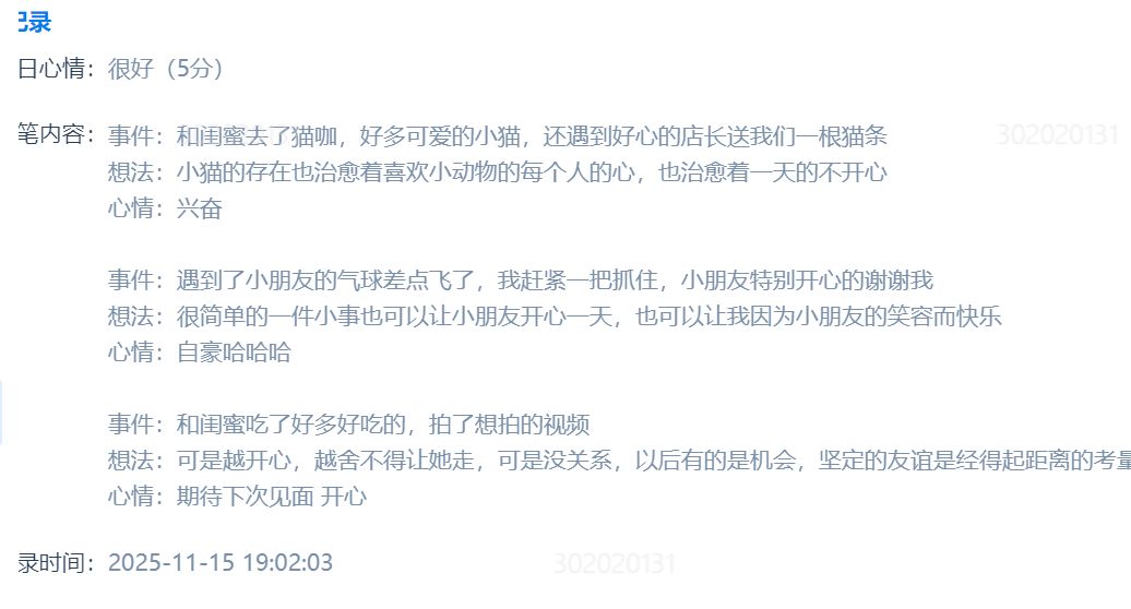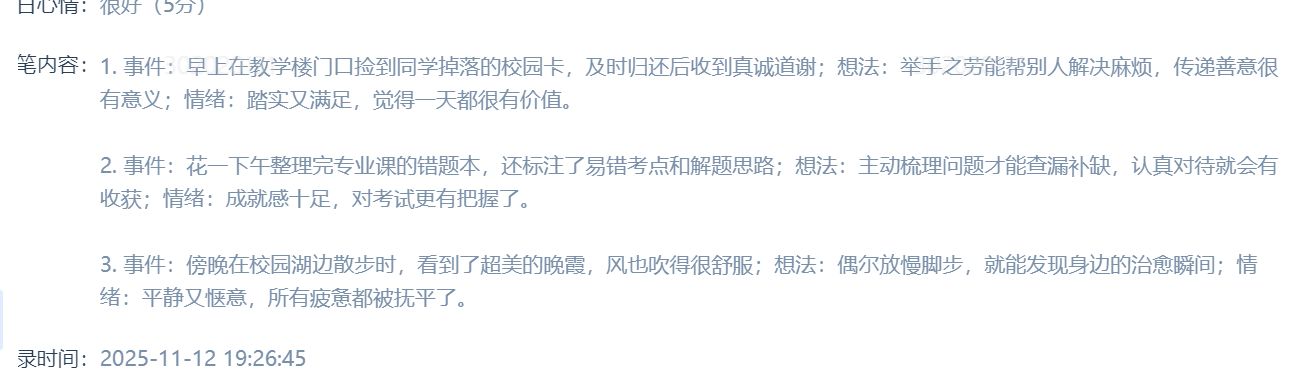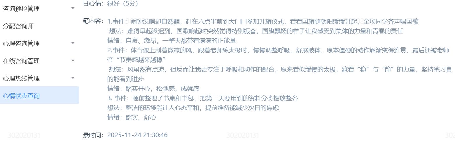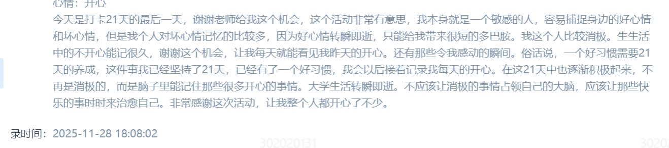 同学们通过学校心理健康信息化管理平台,每日以“事件+想法+情绪”格式记录三件好事,涵盖生活小确幸、成长进步与情绪收获。大家以文字、图片等多种形式,真诚分享日常温暖与成长点滴。活动累计收到数千条打卡内容,涌现出许多真实感人、充满正能量的优秀记录。许多同学反馈,通过主动寻找和记录好事,自己对生活的感知更加敏锐,心态也变得更加平和与积极。