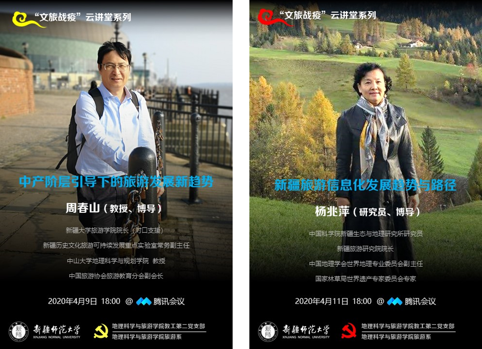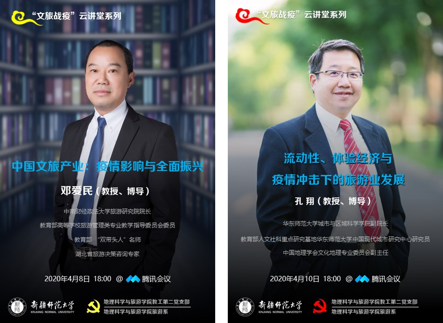 对于高校教师、学生而言,做好疫情期间的教育教学工作。科学落实停课不停学,把疫情对学生对教学的影响降到最低,bat365中文官方网站教工第二党支部和旅游系结合专业特色发起了“文旅战疫”云讲堂活动,邀请文旅大咖从不同的视角为旅游管理专业师生解读“战疫”之后文旅产业的应变之道。应邀参加此次活动的专家有中南财经政法大学旅游研究院院长、教育部“双带头人”、教育部高等学校旅游管理专业教学指导委员会委员邓爱民教授;新疆大学旅游学院院长、新疆历史文化旅游可持续发展重点实验室常务副主任、中国旅游协会旅游教育分会副会长周春山教授;华东师范大学城市与区域科学学院副院长、教育部人文社科重点研究基地研究员、中国地理学会文化地理专业委员会副主任孔翔教授和新疆旅游研究院院长、国家林草局世界遗产专家委员会专家、中国科学院新疆