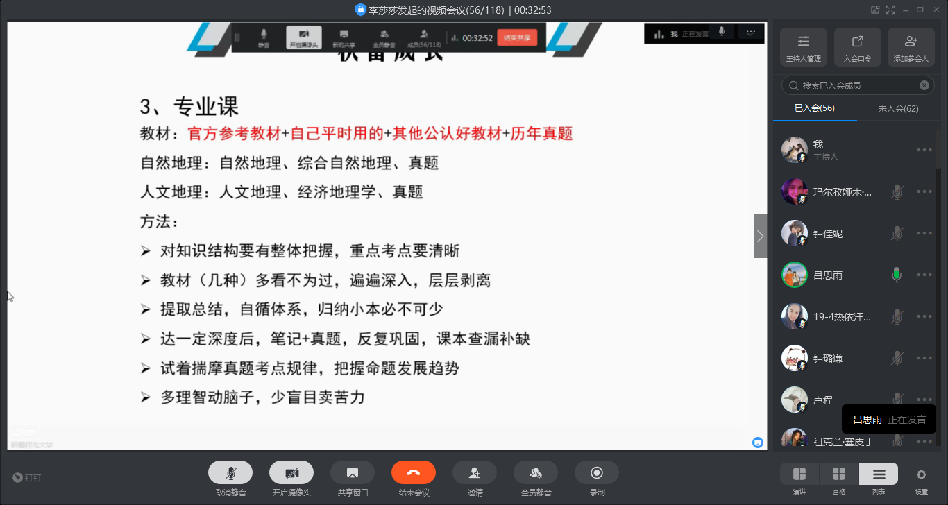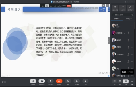 为了深入服务广大地科学子,6月3日下午16:30,bat365中文官方网站本科生第一党支部组织bat365中文官方网站的考研群体在钉钉上开展了以“考研经验交流”为主题的活动。 参与这次交流会的有本科生一支部书记李锐老师、本科生一支部考取疆内外研究生代表4位同学以及学院有考研意愿的100余位同学。本次的会议由毕业生李莎莎同学主持。