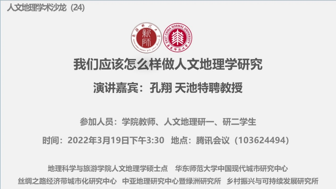 2022年3月19日下午3:30,bat365中文官方网站举办的第24期人文地理学术沙龙在线上召开。此次学术沙龙由学院黄佛君副教授主持,华东师范大学城市与区域科学学院的孔翔教授,作《我们应该怎样做人文地理学研究》主题讲座。孔翔教授用深厚的学术底蕴和研究阅历,希望引领新bat365地科院年轻教师和研究生走进人文地理学的研究。