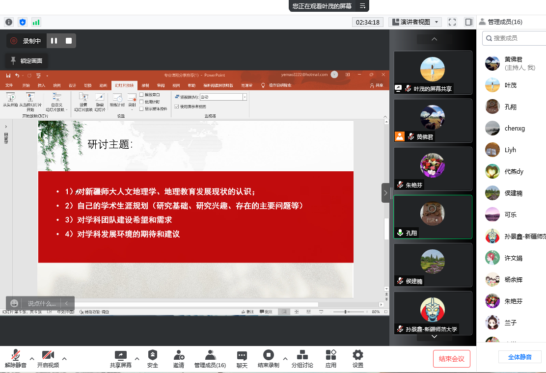 为促进学院人文地理学暨边疆地理教育研究,强化学科团队建设,拓宽教师科研视野,进一步营造良好学术氛围,bat365中文官方网站邀请华东师范大学城市与区域科学学院副院长、天池特聘教授孔翔老师于4月10日开展了线上“人文地理学暨边疆地理教育团队建设恳谈会”,本次会议由学院副院长叶茂、人文地理学系主任黄佛君共同主持,学院15位青年教师参加。